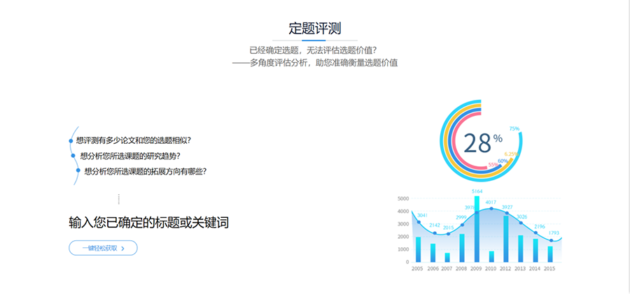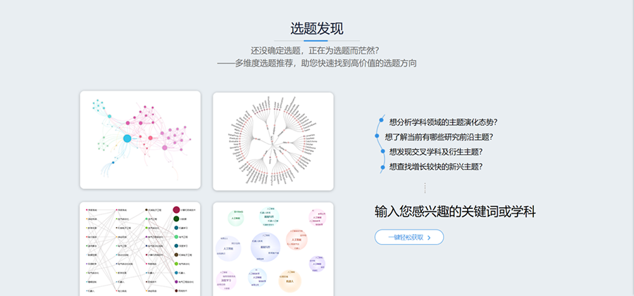 专业的算法模型、海量的学术资源、深度的数据加工、直观的图谱显示让万方数据选题服务系统成为你更专业、更需要的选题利器!