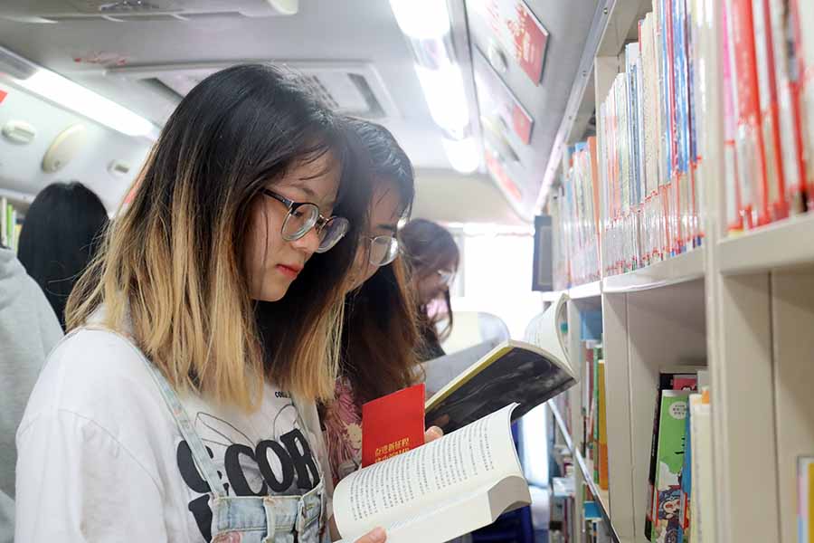 “哇塞,谁能想到这辆公共汽车里还藏着一座图书馆,我要好好看这本《百年初心成大道》的书,一会争取在知识问答环节答对题目拿奖品呢”。来自21级 商务英语1班的石蕊同学一边说,一边兴奋地在流动图书车里翻阅书籍。